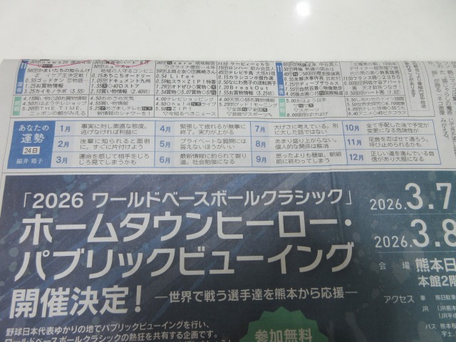 熊日新聞が休刊日の為、また明日お伝え致します。