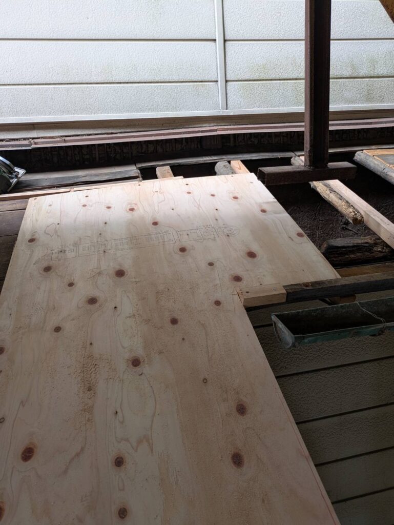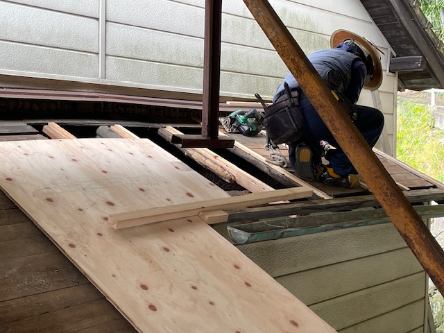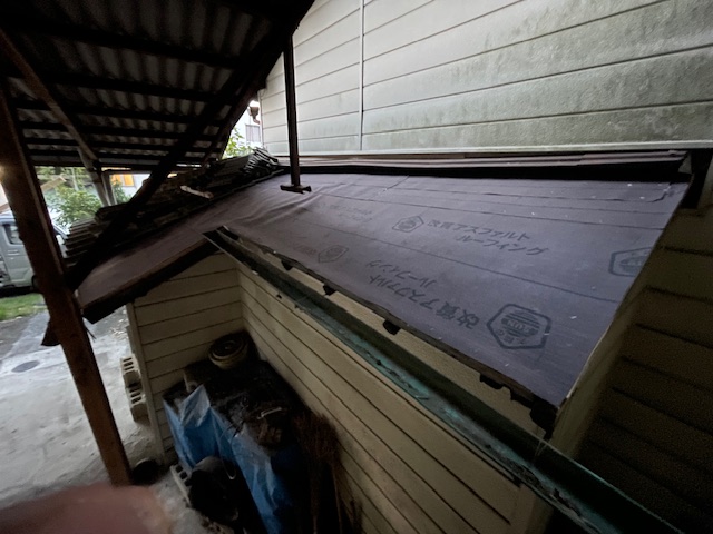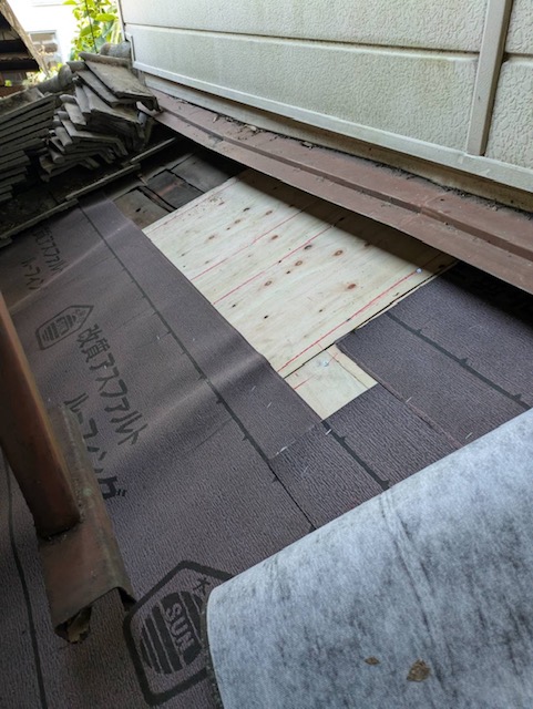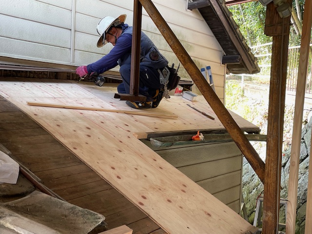 そして、下地の野地板が補強されて防水シートを貼っていきます。