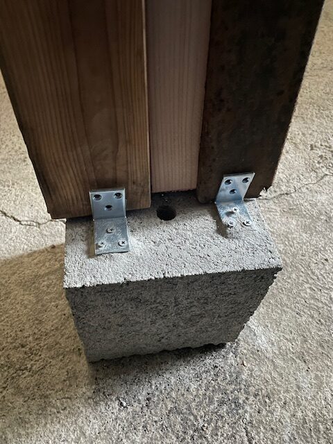 そして擁壁の上の鉄骨の柱もカットして束石を取り付け。