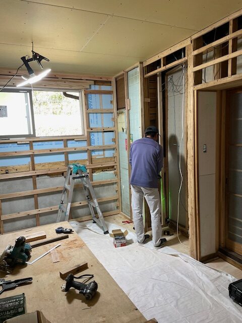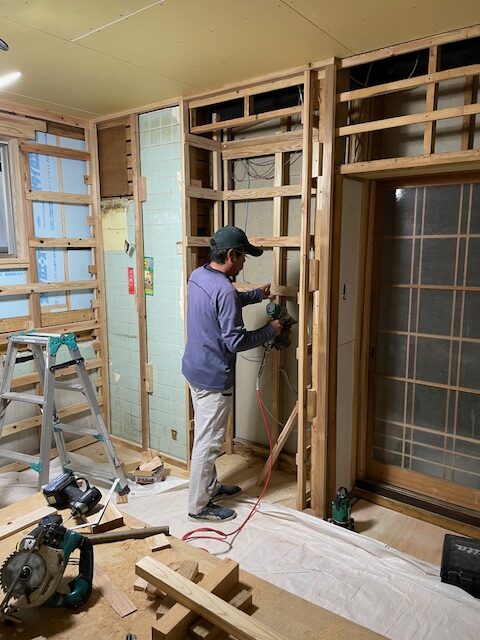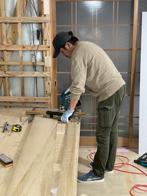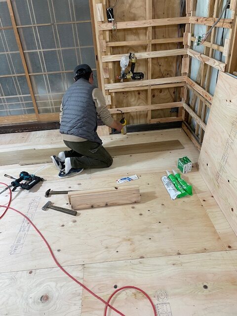 壁の下地補強工事が終われば、次はフローリングを貼っていきます。