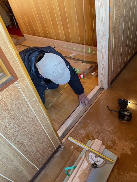 床の高さや、開口部の水平垂直を測量しながらの工事です。