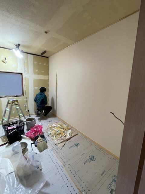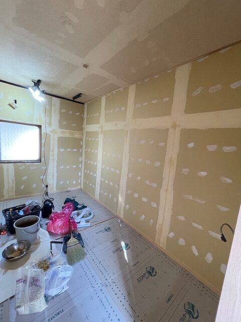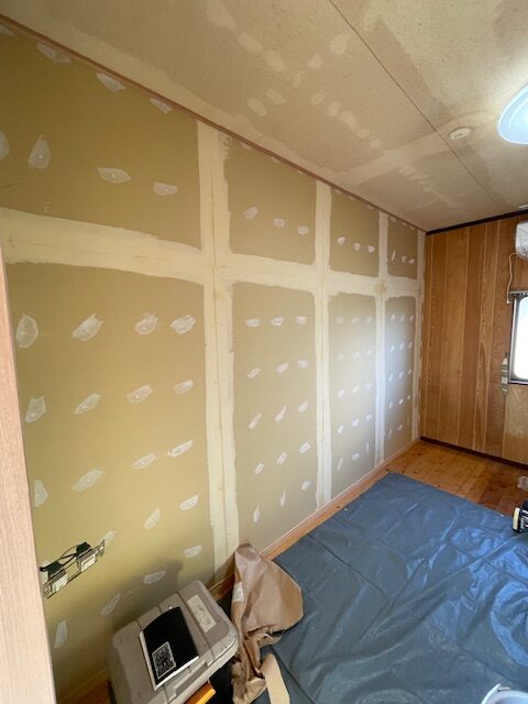 そして、ボード張りが終われば、内装クロス屋さんがパテ処理を行います。