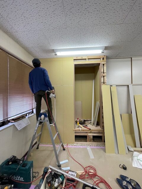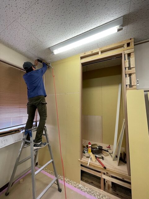 出入口の片引き戸付近のボードを先に施工していきます。