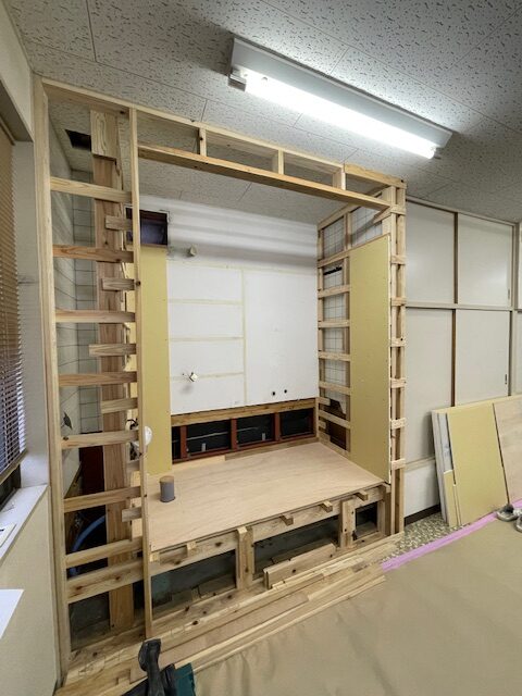 トイレリフォーム工事の玉名市天水町の事務所では、大工さん工事2日目・・・