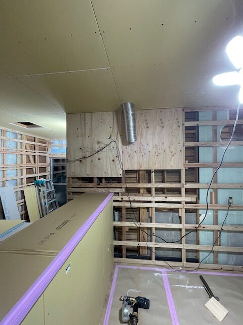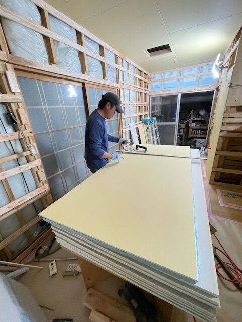 フロア張りが終わり、次は壁下地のボード張りが