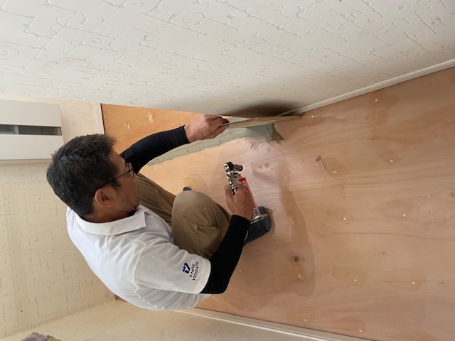 フロアーまで水が染み込んでいるため、床下地からのやり換え。