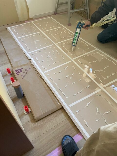 接着剤をシッカリと塗り、フロアを貼っていきます・・・