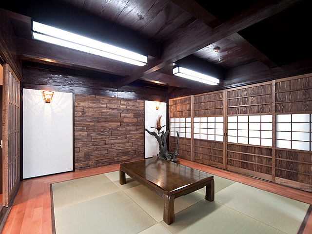 畳の隙間から「底冷え」していた和室8帖は断熱材を充填し何処からも隙間風が入らない様に、暖かい和室へと施工されました。8枚畳を敷き込むのではなく、周りには「桜材」のフローリングを張り中央の畳の部分を囲む形で、計9枚の半帖畳を敷き込みました。周りには家具や荷物などを置き、畳替えの時など大変な思いをされなくて良い様に、工夫されています。また、建具の障子も「古民家風」に特注され雰囲気を出しています。