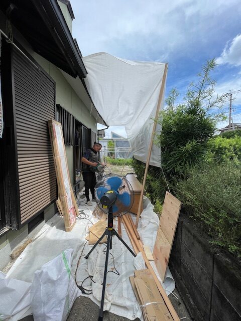日陰を作って作業してもらいます。