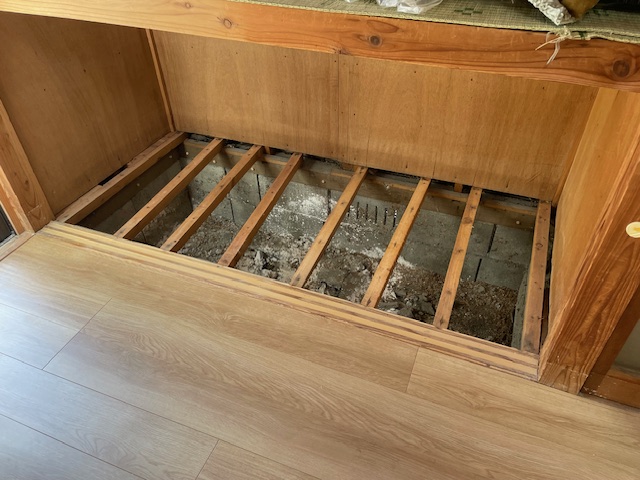 水害復旧工事の八代市鏡町の家では、タンス置き場の床をはがし